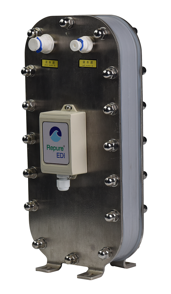 • EDI(Elcctrodeionization)是一種將離子交換技術、離子交換膜技術和離子電遷移技術相結合的純水制造技術。它巧妙的將電滲析和離子交換技術相結合,該項技術的發展克服了離子交換樹脂的局限性,利用兩端電極高壓使水中帶電離子移動,并配合離子交換樹脂及選擇性樹脂膜以加速離子移動去除,從而達到水純化的目的。在EDI除鹽過程中,離子在電場作用下通過離子交換膜被清除。同時,水通過一個或多個在陽離子或陰離子選擇膜之間填滿離子交換樹脂的管腔,在電場的作用下,離子在離子交換樹脂間向管腔的兩側移動并進入另外的管腔,這個過程中也會電解產生維持樹脂處于再生狀態所需的H+和OH- 。流向兩側獨立管腔的離子被水沖刷掉。